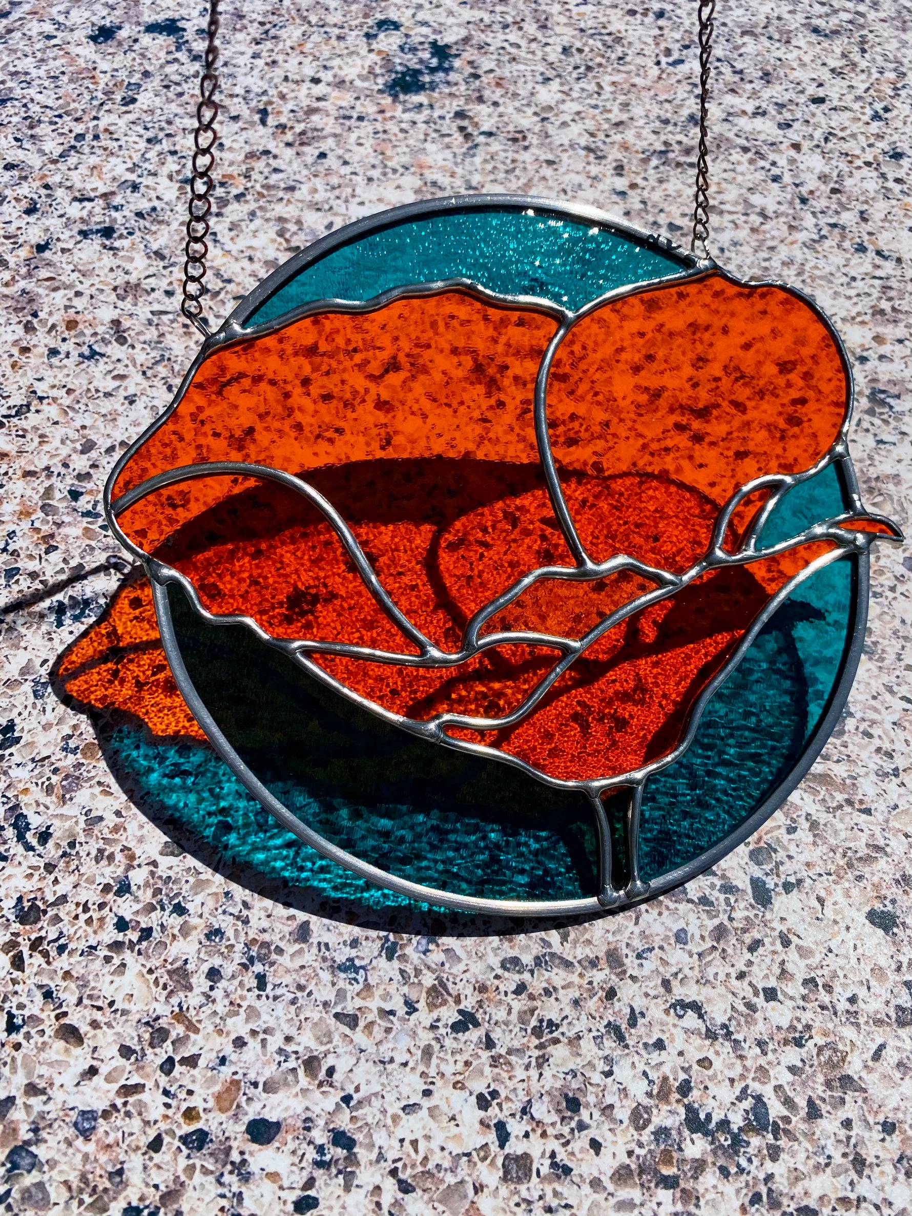 Due to the nature of the glass used in creating this piece, the colors will change depending on the light source.