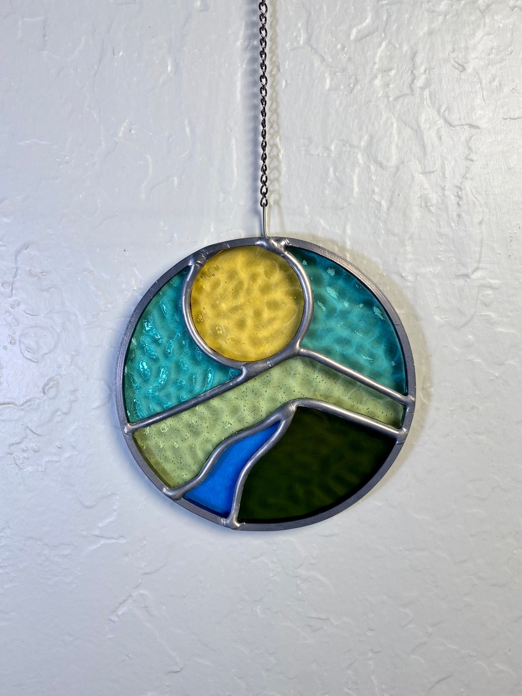 Due to the nature of the glass used in creating this piece, the colors will change depending on the light source.
